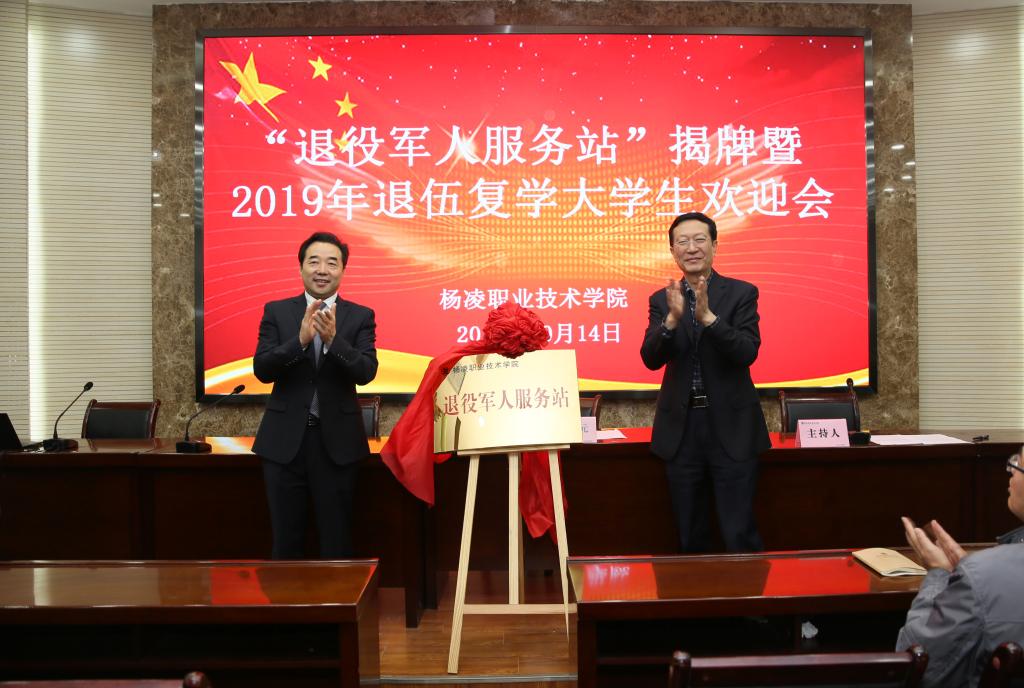 10月14日下午,我院“退役军人服务站”揭牌暨2019年退伍复学大学生欢迎会在水韵楼报告厅举行。党委副书记任得元、杨凌示范区退役军人事务局局长申忠海为“退役军人服务站”揭牌。学院人武部、学生处、教务处、财务处、招就处负责人,分院党总支书记、学工办主任、辅导员代表及2019年78名退伍复学大学生参加活动。