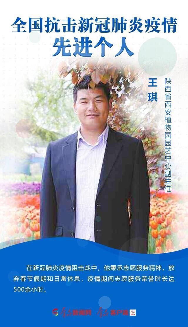 王琪,男,汉族,杨凌职业技术学院生物工程学院生物技术及应用10028班毕业生,现任陕西省西安植物园园艺中心副主任一职。在新冠疫情期间,王琪同志秉承志愿服务精神,放弃春节假期和日常休息,疫情期间志愿服务荣誉时长达500余小时。王琪同志的突出事迹,为广大杨职学子树立了良好的榜样,全体杨职师生为他感到无比骄傲,我们将在今后的学习和生活中向王琪同志学习,深入贯彻习近平总书记讲话精神,不忘初心,牢记使命。