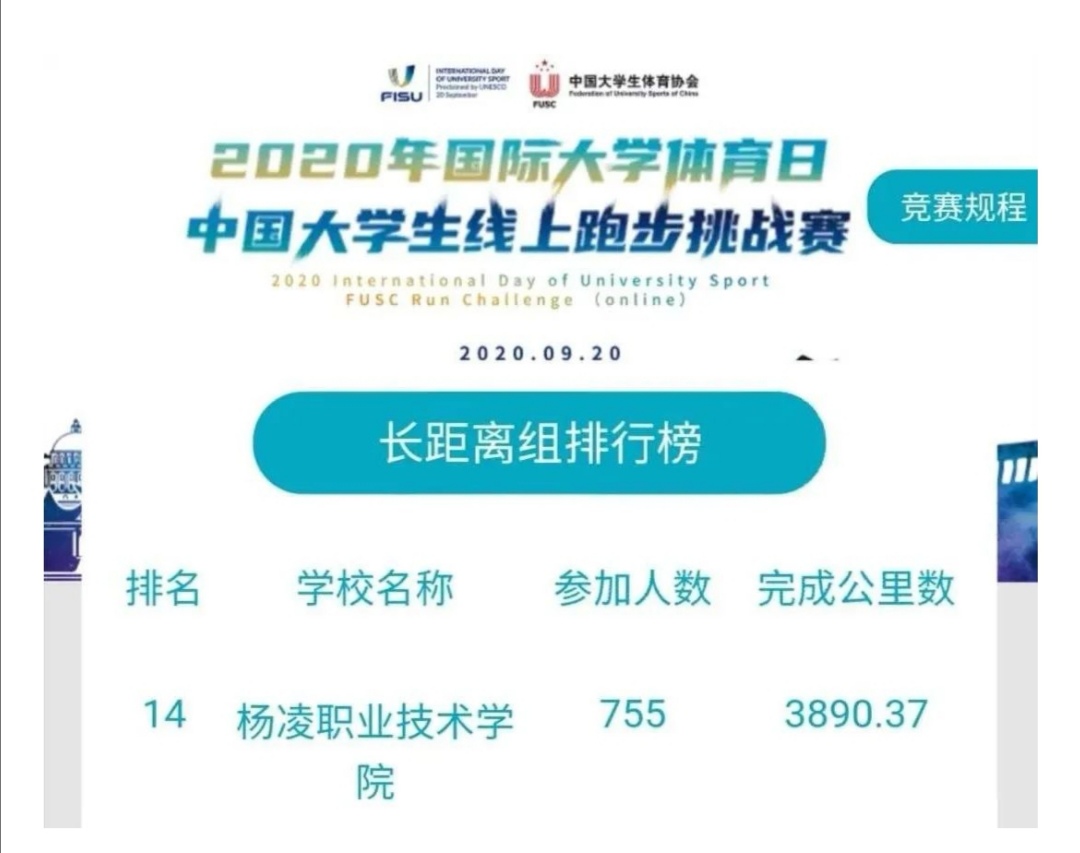 9月18日到20日,中国大学生体育协会发起“2020年国际大学体育日·中国大学生线上跑步挑战赛”,我院在比赛中获得全国第十四名, 陕西高校排名第一,全国高职院校中排名第三。