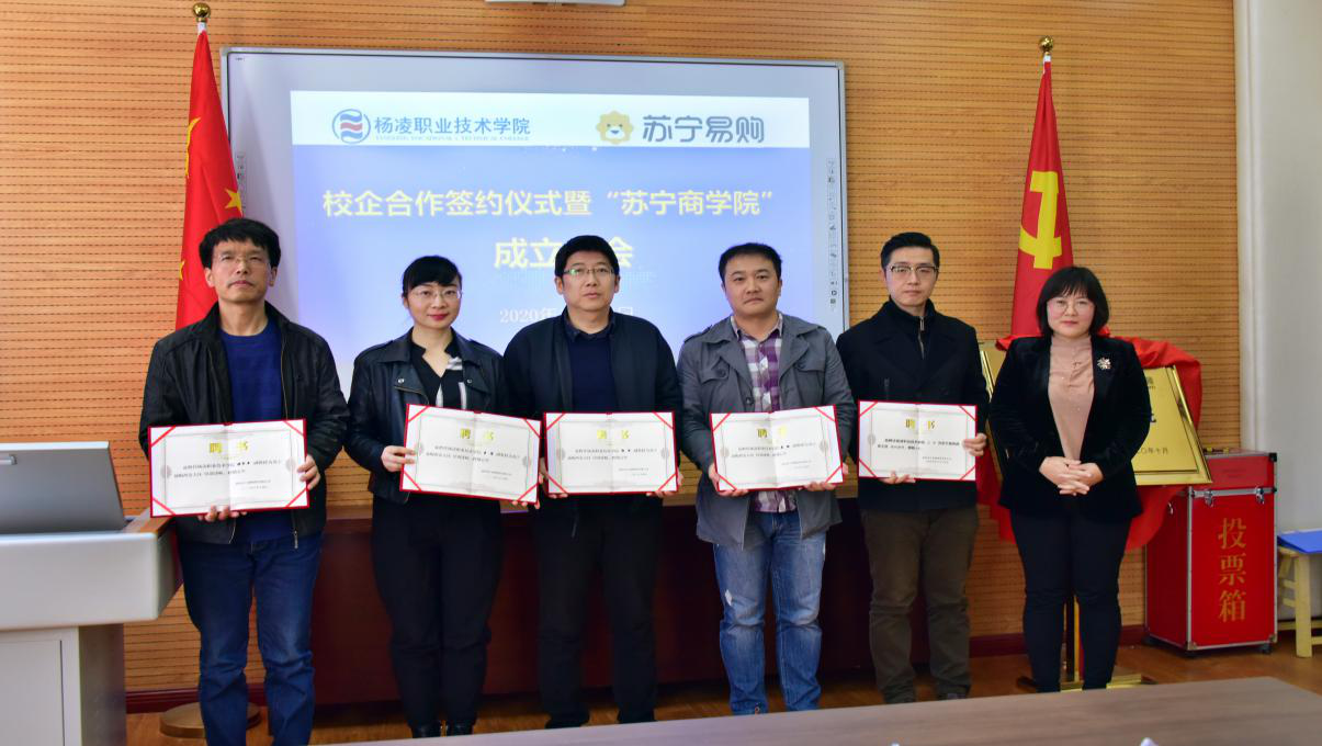 10月16日下午,我校与苏宁易购集团校企合作签约仪式暨“苏宁商学院”成立大会在经济与贸易分院举行。学校党委副书记、纪委书记刘粉莲,学校党委委员、教务处处长拜存有,经济与贸易分院党总支书记李嘉鸣、副院长杨宏祥,陕西苏宁易购销售有限公司总经理程峰,苏宁易购西安大区物流公司总经理雷宏波、电器店运营中心总监肖强、人力资源中心总监杨花,及分院全体教师共40余人参加成立大会。大会由产教融合处副处长郑爱泉主持。
