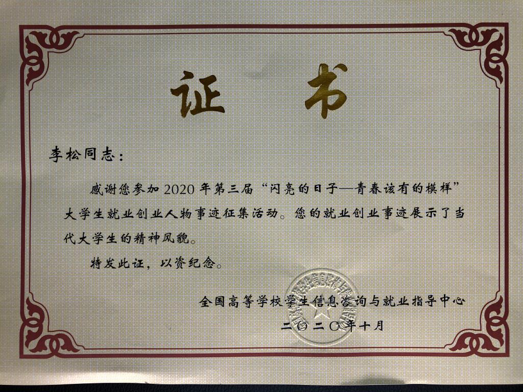 为加强高校毕业生就业创业宣传,全国高等学校学生信息咨询与就业指导中心组织开展了第三届“闪亮的日子——青春该有的模样”大学生就业创业人物事迹宣传报道活动,我校毕业生李松入选。