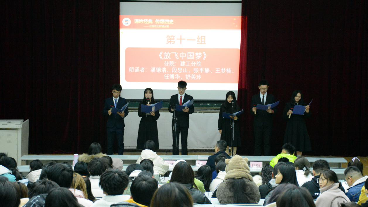 比赛现场氛围活跃、掌声阵阵。经过激烈的竞争,最后评出一等奖2组共17人,二等奖6组共28人,三等奖7组共40人,优秀奖30人。通过此次比赛,广大师生不仅真切地领略到中华诗文的经典,体悟到诗文意境,感受到美的熏陶,更加深了对“四史”的理解和新时代中国共产党人的初心及历史使命的认识。