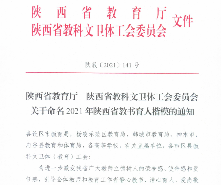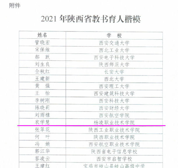 近日,陕西省教育厅、陕西省科教文卫体工会委员会公布了2021年“陕西省教书育人楷模”名单,我校衣学慧教授获此殊荣。