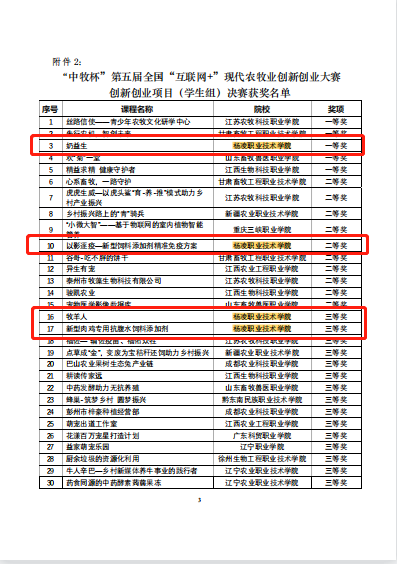 近日,在中国现代畜牧业职教集团主办的“中牧杯”第五届全国“互联网+”现代农牧业创新创业大赛决赛中,我校荣获一等奖1项,二等奖1项,三等奖2项。