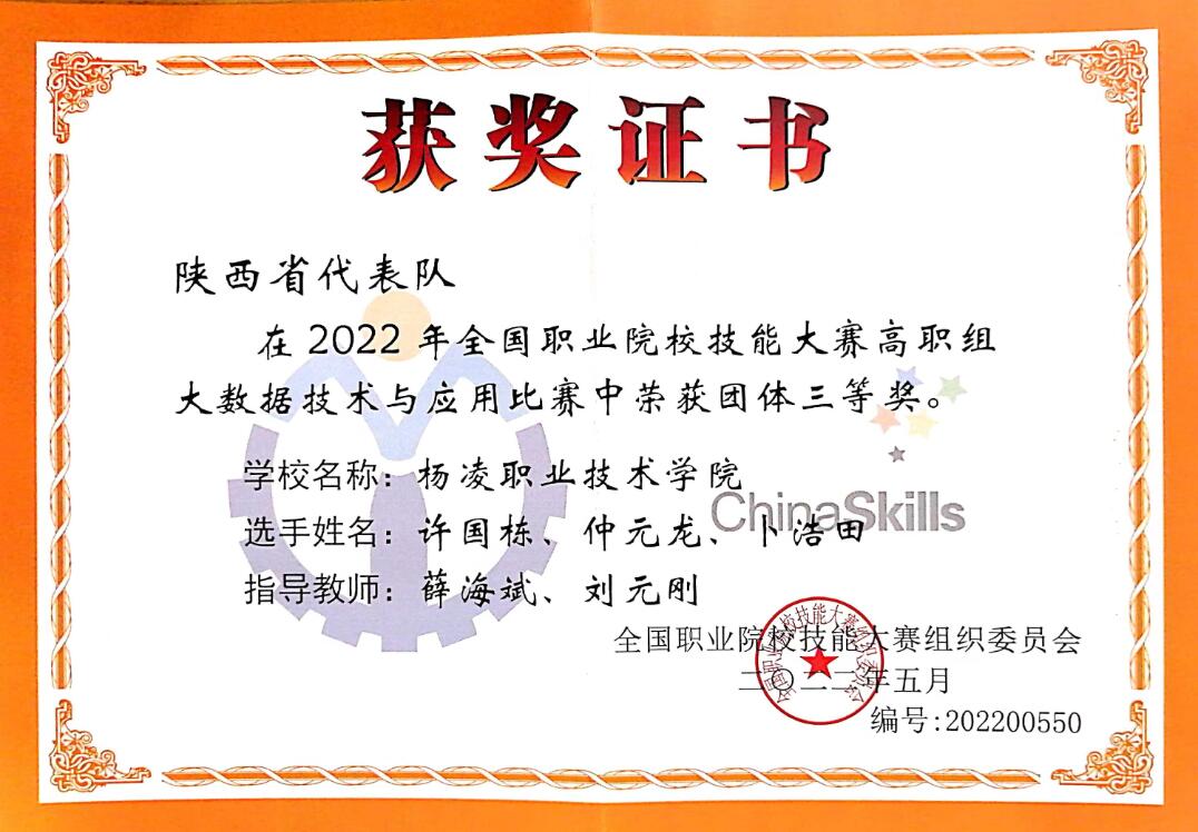 7月30日,2022年全国职业院校技能大赛“大数据技术与应用”赛项(高职组)举行,学校信息工程学院学生仲元龙、卜浩田、许国栋代表陕西省参赛并荣获三等奖,取得学校在该赛项的新突破。