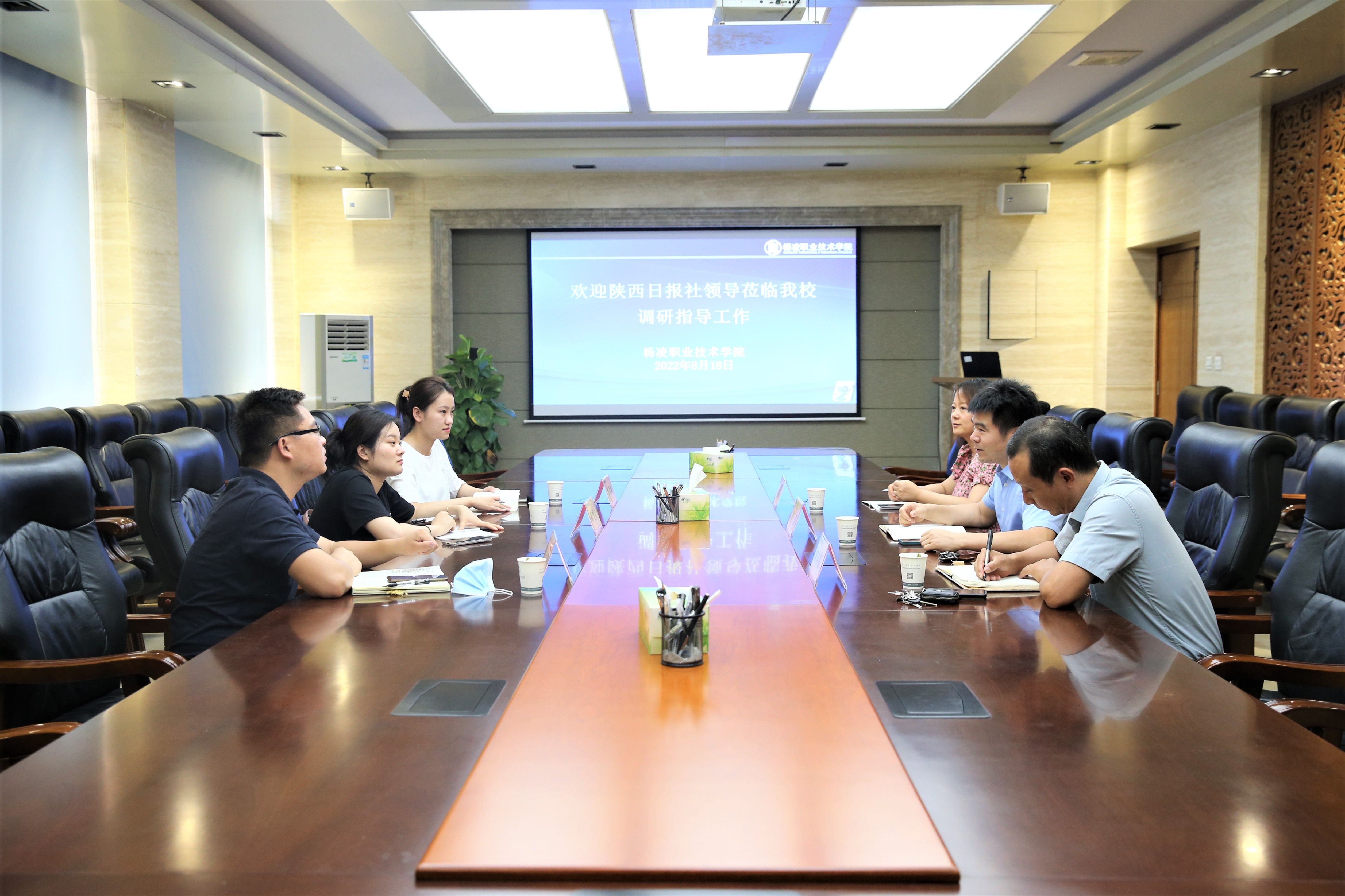 8月18日下午,陕西日报传媒集团考核管理部主管师雯静、陕西日报传媒集团人力资源部主管常芳琳、陕西日报社杨凌记者站站长仵永杰一行来到我校,就学校在职业教育培训、助力乡村振兴等方面进行调研。学校继续教育与培训学院、村干部(农民)发展学院负责人黄璞,党委宣传部相关人员参加座谈会。