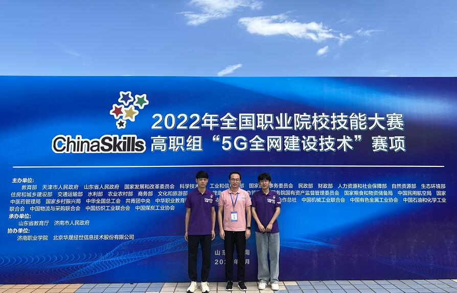 8月22日至23日,2022年全国职业院校技能大赛高职组“5G全网建设技术”赛项在济南职业学院举办,来自全国28个省、56支代表队、112名选手参加了比赛。经过8个小时的激烈比拼,我校信息工程学院学生郑嘉昊、曹文森以总分排名全国第一的成绩,荣获一等奖第一名,取得我校自参赛以来历史最好成绩,指导教师康晋、陈高锋荣获大赛优秀指导教师奖。