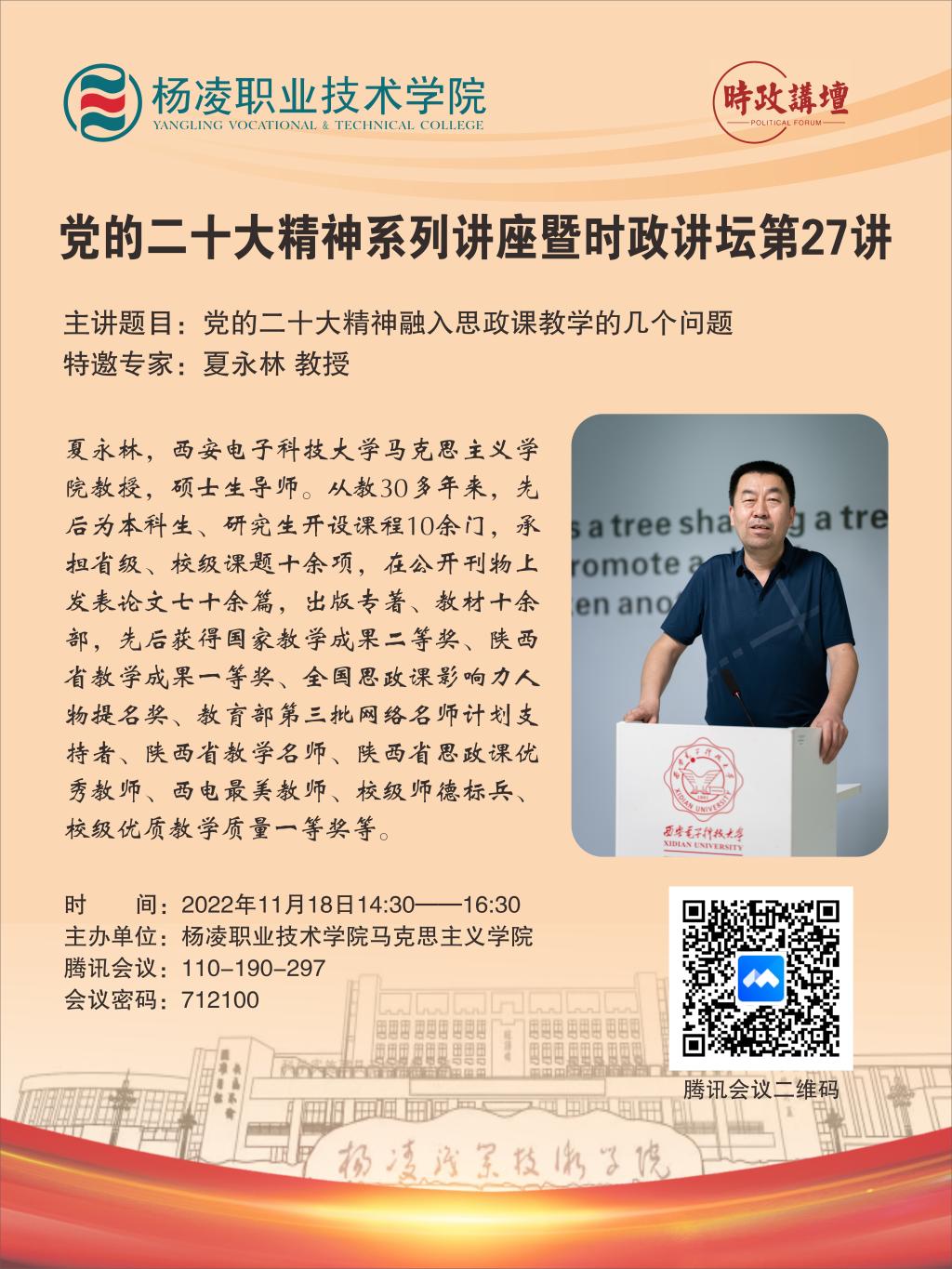 11月18日下午,党的二十大精神系列讲座暨时政讲坛第27讲在我校举办。讲坛邀请西安电子科技大学马克思主义学院原党委书记夏永林教授作题为“党的二十大精神融入思政课教学的几个问题”的主题报告。报告通过线上形式进行,国内20多所学校近300名思政课教师聆听了报告。