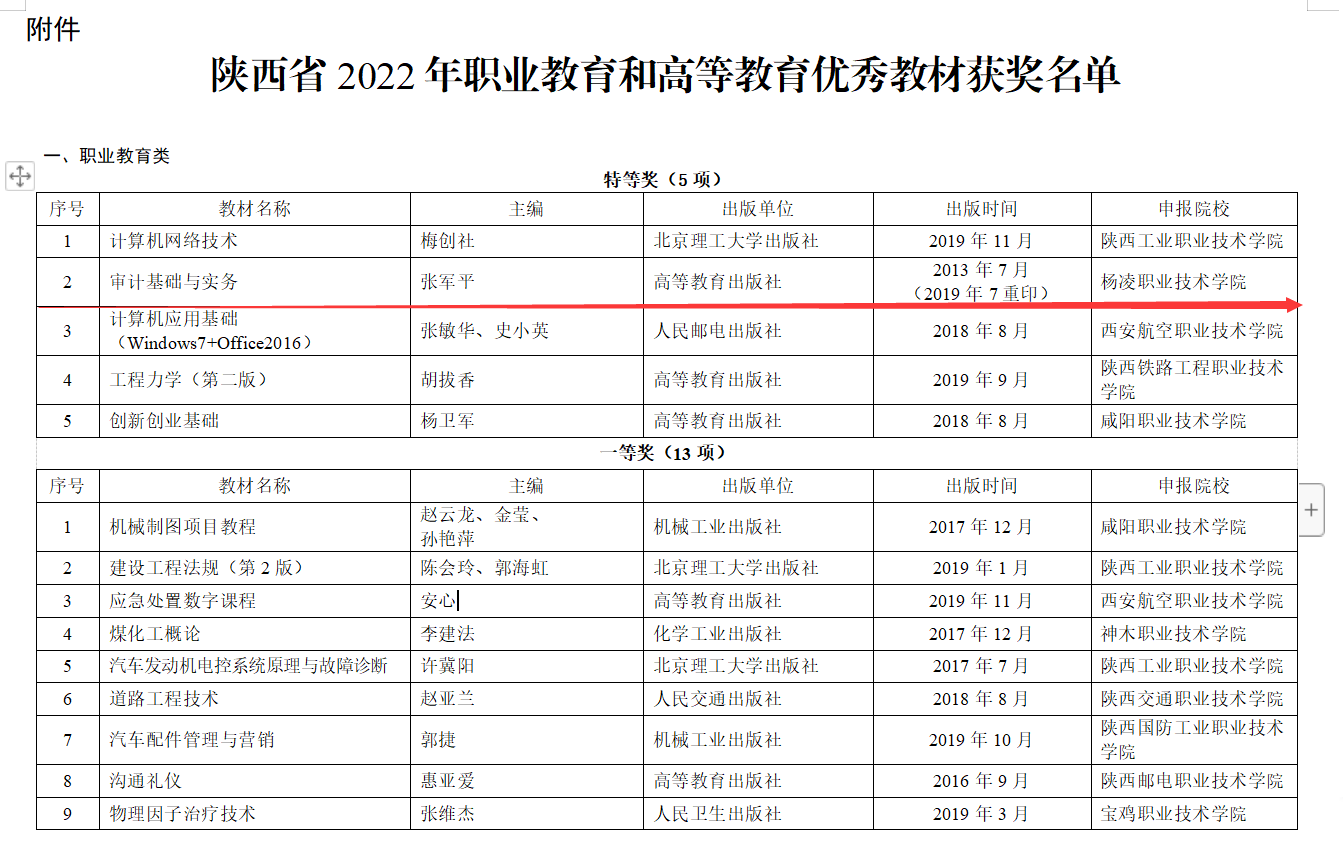 陕西省优秀教材奖评选由省教育厅组织,每两年一次。本届优秀教材评选共评出职业教育类教材特等奖5项、一等奖13项、二等奖21项。