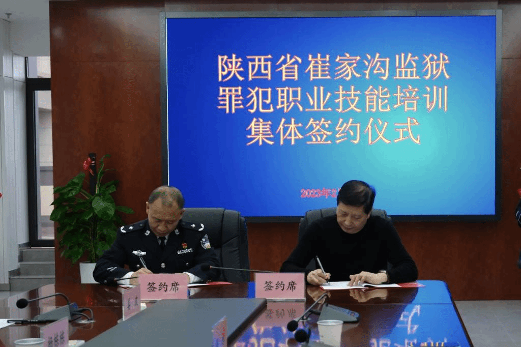 2月12日下午,学校与陕西省崔家沟监狱罪犯职业技能培训集体签约仪式在崔家沟监狱指挥大楼举行。副校长祝战斌、生物工程分院副院长杨振华、崔家沟监狱政委宋晓鹏、副政委王云峰、副监狱长张建瑞出席签约仪式。