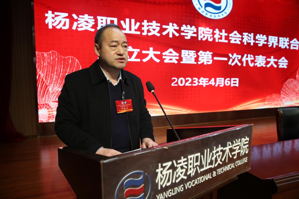 郭建树在讲话中,代表陕西省社科联对杨凌职院社科联的成立及新当选的第一届委员会委员表示热烈祝贺。他指出,杨凌职业技术学院社科联的成立,是以实际行动贯彻落实二十大精神,充分体现了学校对哲学社会科学工作的重视及对哲学社会科学工作者的关心。杨凌职业技术学院社科联的成立是杨凌职业技术学院的一件大事,也是我省社科界的一件喜事,为学校新文科建设搭建了新的平台,也壮大了我省社科联组织基础。他分析了陕西省哲学社会科学发展的现状、问题及规划,简要介绍了省社科联针对存在问题的工作思考。他充分肯定了杨凌职业技术学院近年来的发展及在哲学社会科学领域取得的成绩。他希望,学校社科联一是要举旗帜,始终坚持马克思主义指导地位,贯彻习近平新时代中国特色社会主义思想。二是要发挥学校优势,服务社会经济发展。三是要积极开展学术交流活动,促进学科发展和人才队伍建设,切实发挥社科联桥梁纽带作用,努力推进社科事业繁荣发展。他表示,省社科联将大力支持杨凌职业技术学院社科联开展工作,在课题研究、学术交流、社科服务以及人才推荐等方面给学校社科工作者提供更广阔的平台,促进学校社科联健康成长和发展壮大。