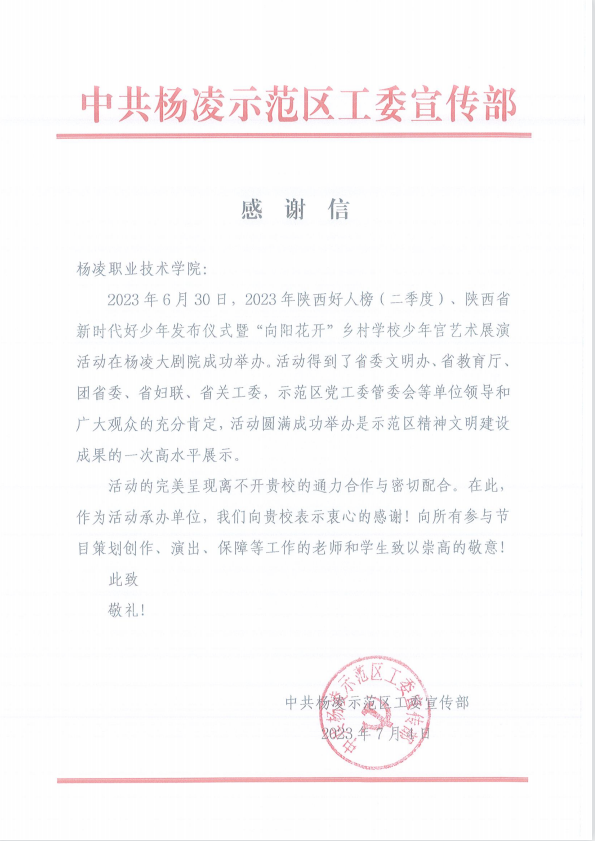 7月4日,学校收到中共杨凌示范区工委宣传部的感谢信。在信中,杨凌示范区宣传部对学校在2023年陕西好人榜(二季度)、陕西省新时代好少年发布仪式暨“向阳花开”乡村学校少年宫艺术展演活动中给与的支持和帮助表示诚挚的感谢。