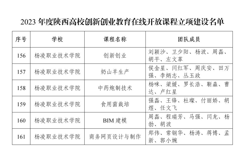 近日,陕西省教育厅公布了2023年陕西高校创新创业教育在线开放课程立项名单,我校创新创业学院刘颖沙主持的《创新创业》、动物工程学院侯金星主持的《奶山羊生产》、药物与化工学院杨咪主持的《中药炮制技术》、生物工程学院强磊主持的《食用菌栽培》、建筑工程学院周磊主持的《BIM建模》、经济与贸易学院郑伟主持的《商务网页设计与制作》等6门课程获批陕西省高校创新创业教育在线开放课程,立项数量及立项率均居同类院校前列。