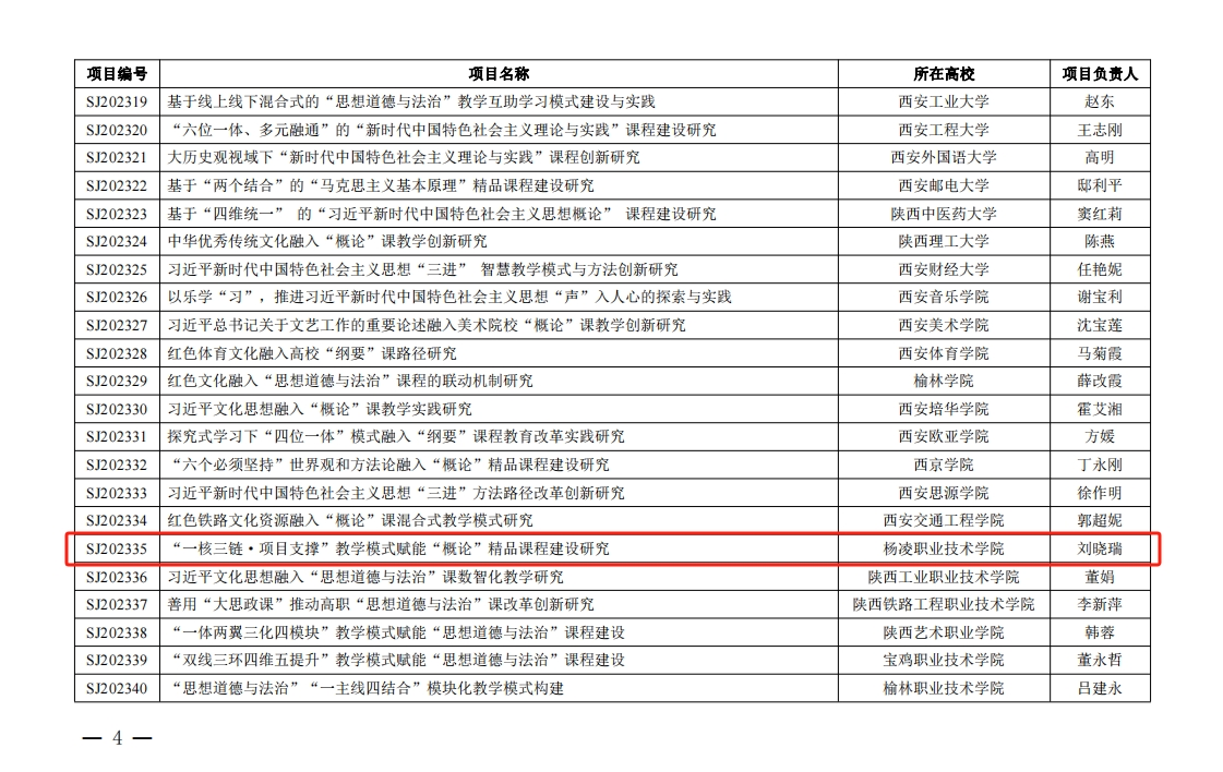 4月3日,陕西省委教育工委公布了2023年度习近平新时代中国特色社会主义思想“三进”省级精品思政课程项目立项名单,我校马克思主义学院刘晓瑞副教授主持的《“一核三链·项目支撑”教学模式赋能“概论”精品课程建设研究》获批立项。