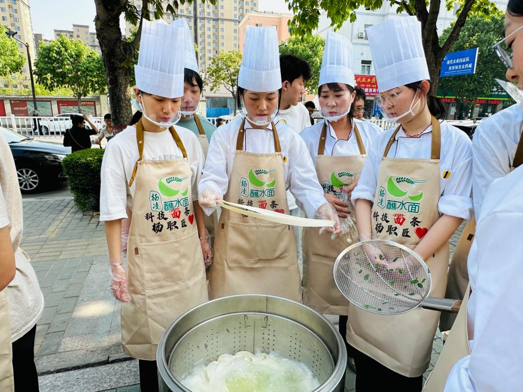 品鉴活动设置“科技创新体验组”、“国际合作体验组”、“乡村振兴体验组”、“示范推广体验组”等四个组别,参赛选手中有高校师生、有社区居民、有蘸水面商家,杨职代表队参加的是“示范推广体验组”。活动中,我校师生把一块块面团,通过揉、擀、扯、甩的手法,加工成又宽又长、又薄又劲道的面条,大家配合默契、技术到位、分工明确,完美展现了我校学生的风采。