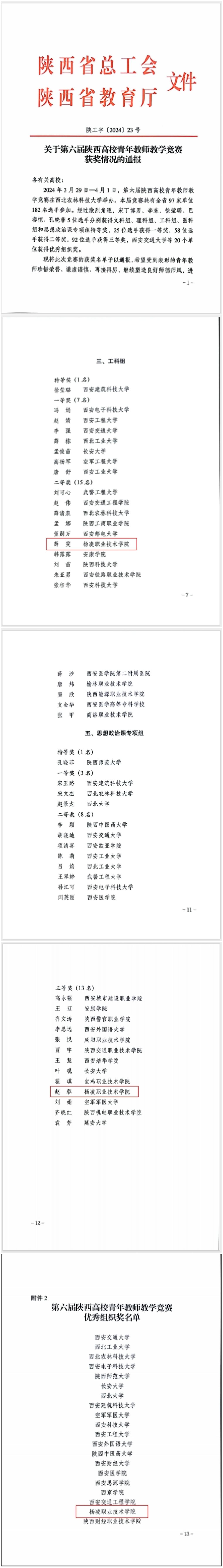 近日,省总工会和省教育厅通报了第六届陕西高校青年教师教学获奖情况,学校获优秀组织奖,生物工程学院教师薛雯获工科组二等奖,马克思主义学院教师赵蓉获思想政治课专项组三等奖。