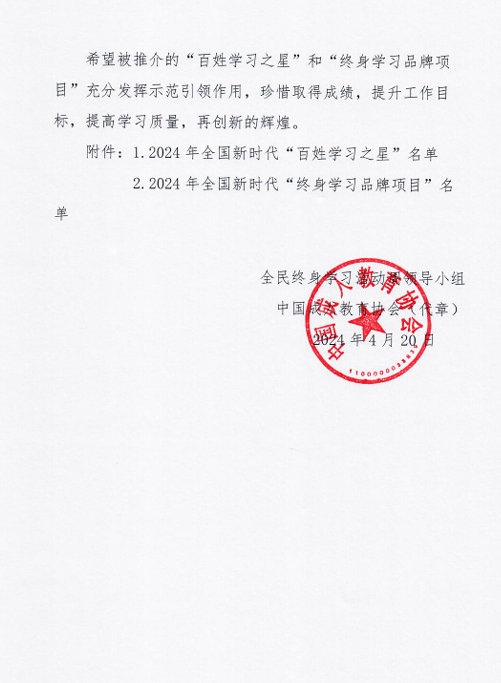 近日,中国成人教育协会和省教育厅公布了2024年全国和全省新时代“终身学习品牌项目”推介名单,我校继续教育与培训学院《“农民吹哨 专家报到”终身教育促振兴》项目成功入选全国和全省新时代“终身学习品牌项目”。这是学校第二次获得全国新时代“终身学习品牌项目”,也是连续四年获得省级新时代“终身学习品牌项目”。