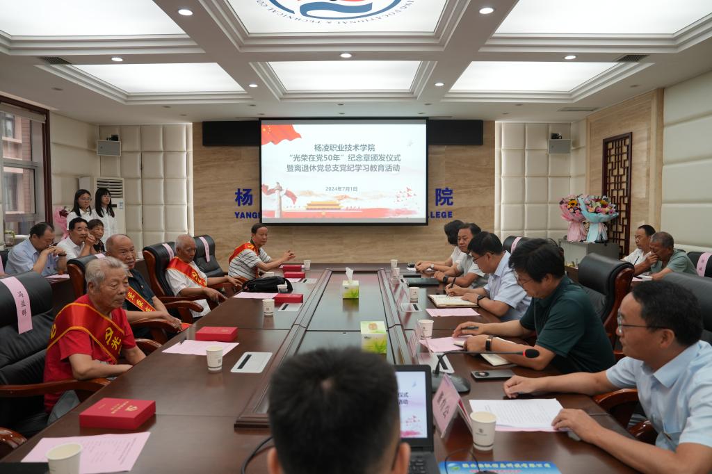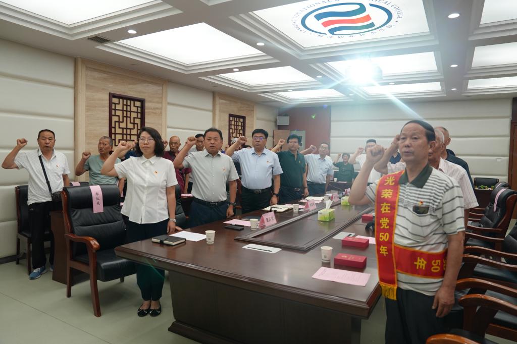 仪式上,全体党员肃立在鲜红的党旗前,重温了入党誓词。刘瑞明为荣获“光荣在党50年”纪念章的老党员们佩戴纪念章,向他们表示热烈祝贺并致以崇高的敬意。随后,组织离退休党员观看了党纪学习教育警示片,离退休工作处负责人为大家讲了题为《学条例 守党纪——全面加强纪律建设 做合格共产党员》的党纪学习教育专题党课。