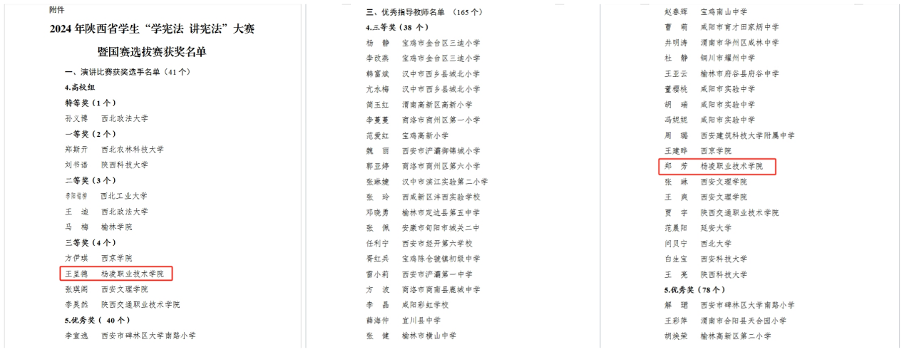 9月27日,省教育厅公布了2024年陕西省学生“学宪法讲宪法”大赛暨国赛选拔赛获奖名单。我校生态环境工程学院学生王呈德获高校组演讲比赛三等奖,马克思主义学院教师郑芳获优秀指导教师三等奖,取得全省高职院校参赛最好成绩。
