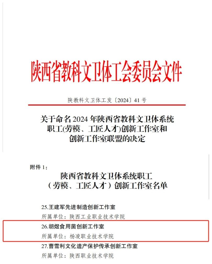 近日,陕西省教科文卫体工会委员会公布了2024年陕西省教科文卫体系统职工(劳模、工匠人才)创新工作室名单。我校胡煜食用菌创新工作室入选。