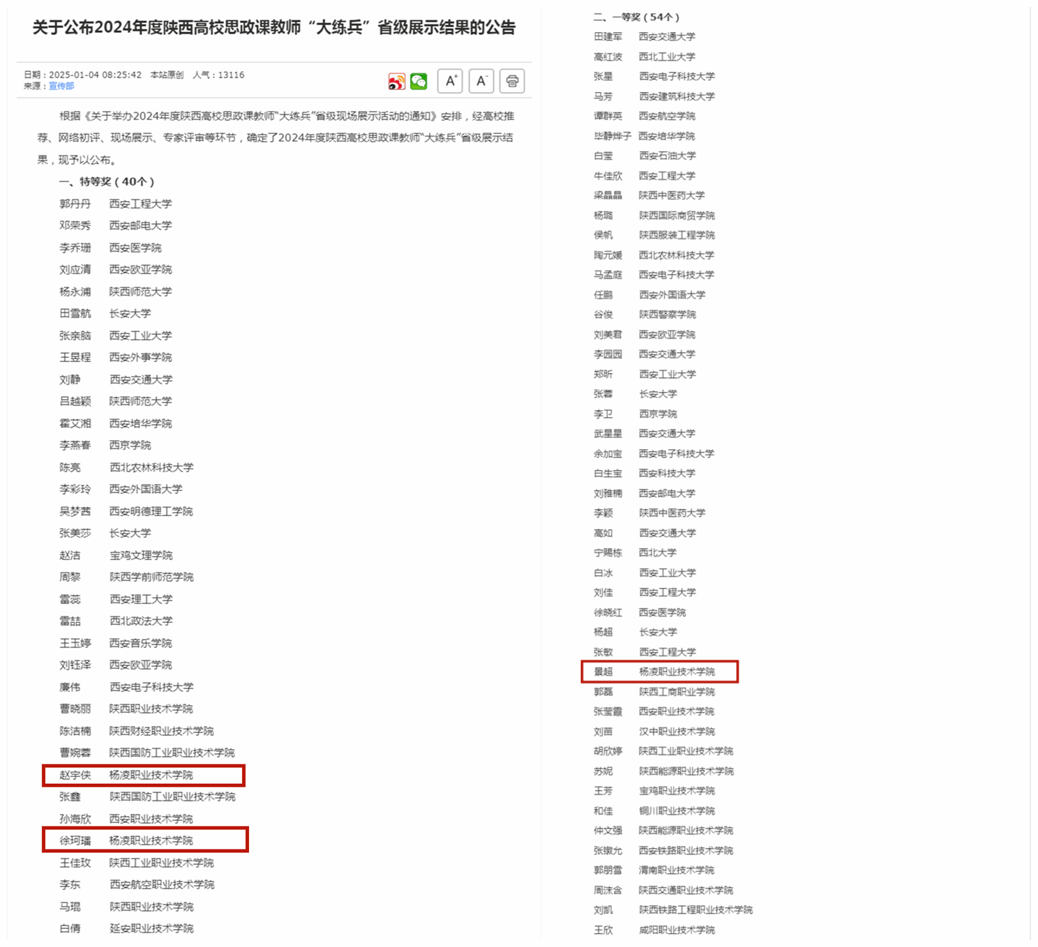 1月4日,省委教育工委、省教育厅公布了2024年度陕西高校思政课教师“大练兵”省级展示结果,我校马克思主义学院教师赵宇侠、徐珂璠荣获特等奖,景超荣获一等奖,综合成绩位列全省高校前列。