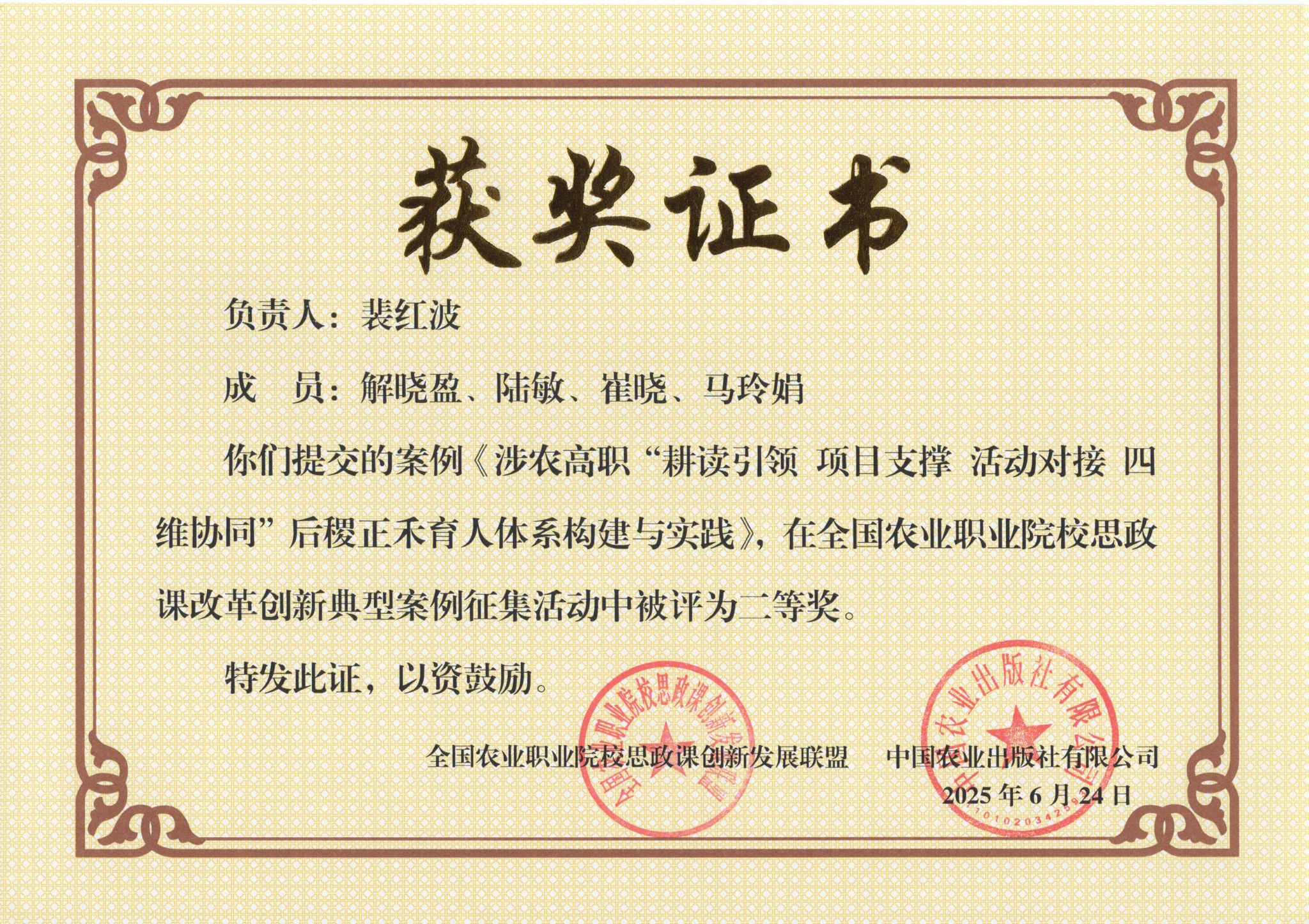 近日,全国农业职业院校思政课改革创新典型案例征集活动获奖名单公布,我校《打造舞台思政课<郑国渠> 探索思政与文化融合育人新路径》获思政课教学模式与教学方法改革一等奖,《涉农高职“耕读引领 项目支撑 活动对接 四维协同”后稷正禾育人体系构建与实践》获“大思政课”建设二等奖。