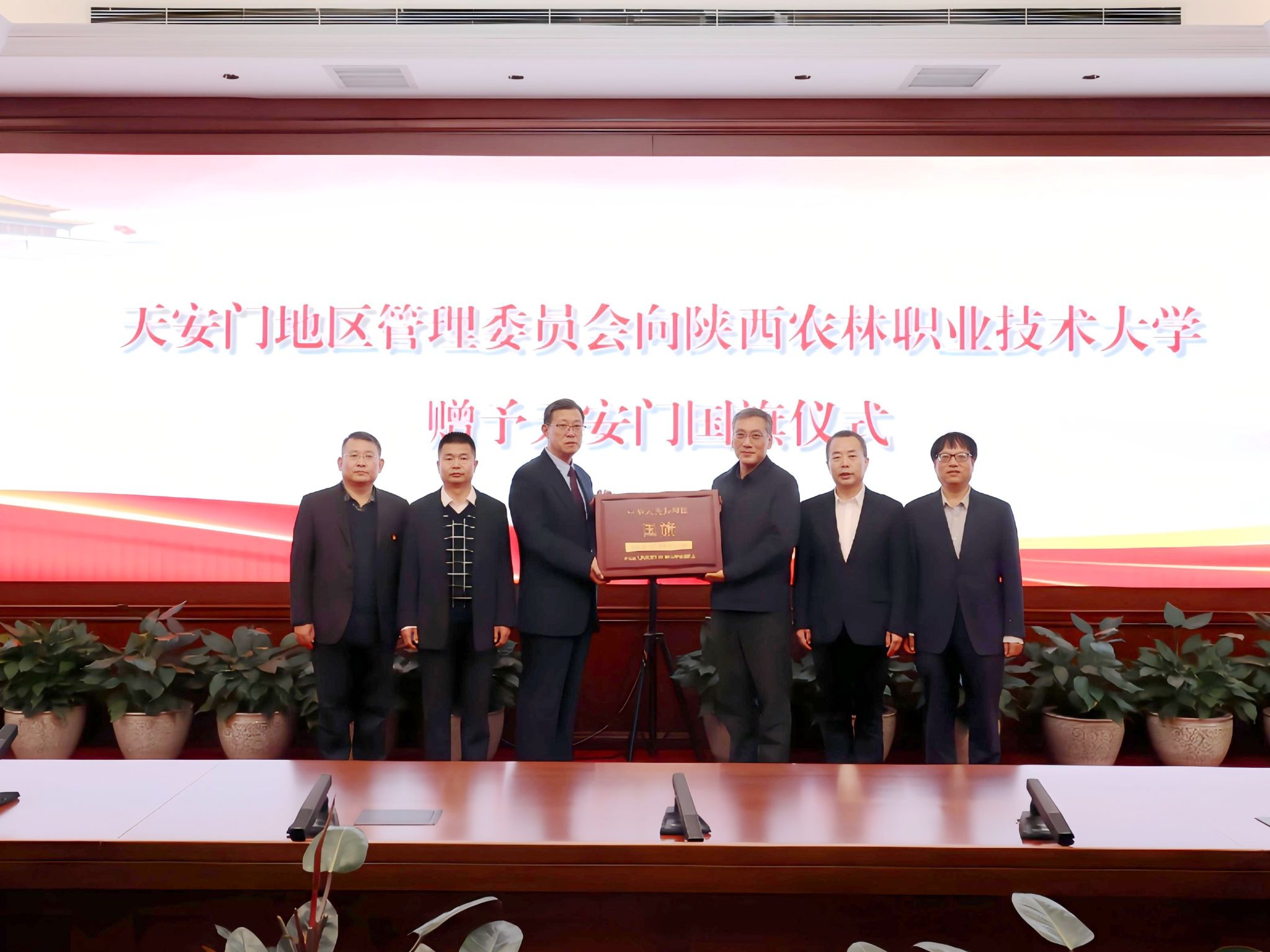 韩明军代表学校庄重接过国旗,并衷心感谢天安门地区管理委员会的信任和支持。他表示,2025年6月9日,是教育部正式发文批准设立陕西农林职业技术大学之日,这面国旗对学校具有极其特殊的纪念意义和教育意义,学校将倍加珍惜,严格按照要求做好国旗的保管和展示工作。
