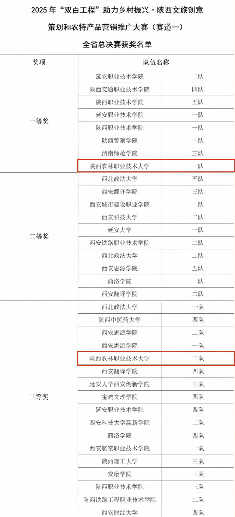 11月29日,2025年“双百工程”助力乡村振兴·陕西文旅创意策划和农特产品营销推广大赛省级决赛圆满落幕。由学校旅游与管理学院孙萌萌、肖彤、阚庆庆、孟莹四位学生组成的参赛团队获“文旅创意策划”赛道一等奖,柏如娇、刘宇涵、聂曼羽、赵徐婷、申国涛五位学生组成的参赛团队获“文旅创意策划”赛道三等奖。