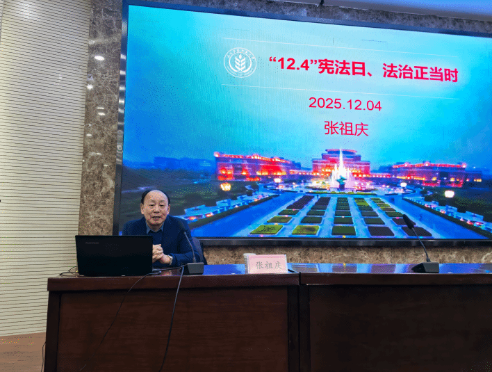 张祖庆以2025年11月1日施行的《法治宣传教育法》为切入点,阐述其“夯实全面依法治国社会基础”的立法意义,以及“终身法治教育”“谁执法谁普法”等核心原则。结合党的二十届四中全会部署,通过典型案例总结“十四五”时期法治建设成就,围绕人工智能法律责任热点案例,引导学生树立法治思维。