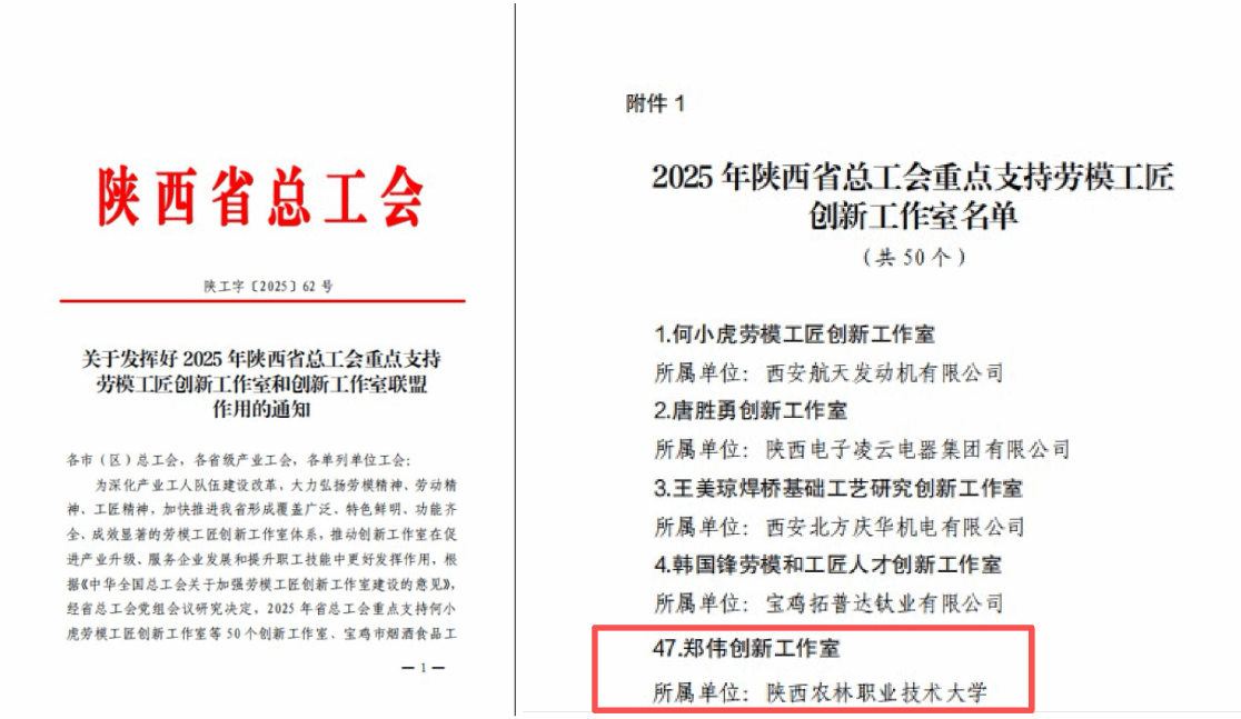 近日,陕西省总工会发布《关于发挥好2025年陕西省总工会重点支持劳模工匠创新工作室和创新工作室联盟作用的通知》(陕工字〔2025〕62号),由校工会牵头申报的“郑伟创新工作室”入选陕西省总工会重点支持劳模工匠创新工作室。