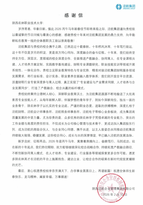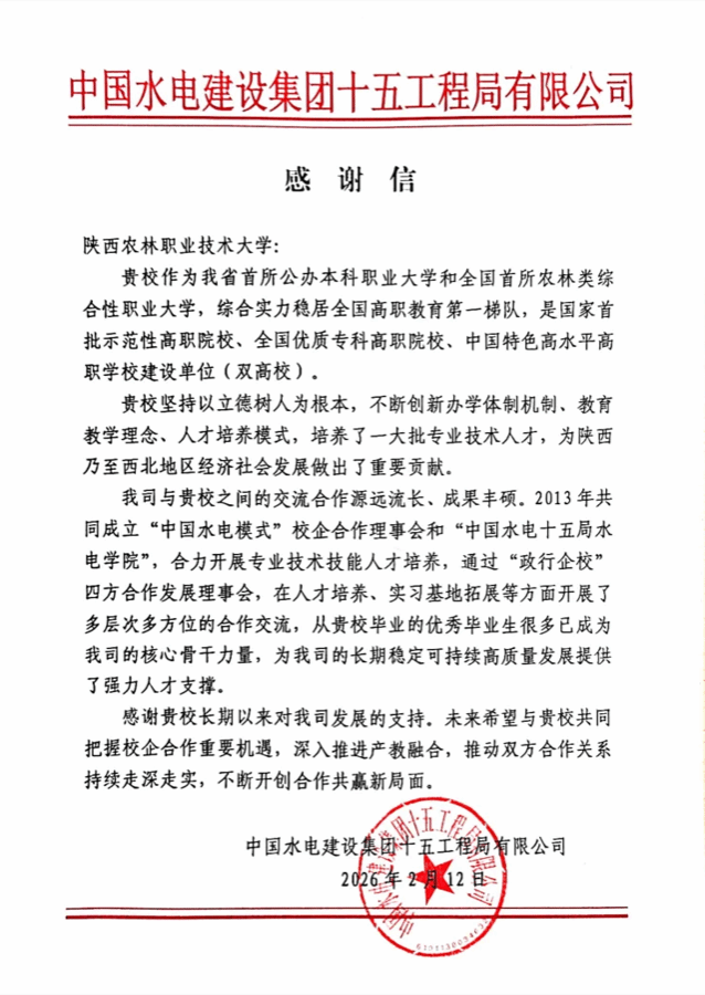 近日,中国水电建设集团十五工程局有限公司、陕西好邦食品股份有限公司、陕西泾航企业管理集团有限公司、陕西标正作物科学有限公司等多家用人单位向学校发来感谢信,对我校毕业生的专业素养、综合能力和敬业精神给予高度评价,并对学校在校企合作、人才共育及就业服务等方面的工作表示感谢。