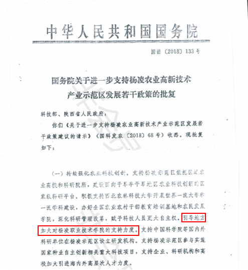 10月26日,国务院《批复》中明确提出“引导地方加大对杨凌职业技术学院的支持力度”。