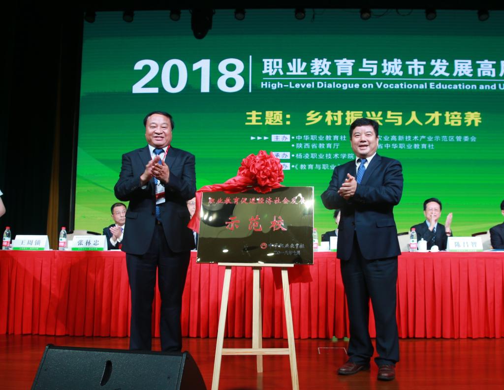 7月3日至4日,“2018职业教育与城市发展高层对话会”在杨凌举行。大会开幕式上,中华职业教育社党组书记、总干事方乃纯向我院授予“职业教育促进经济社会发展示范校”牌子。