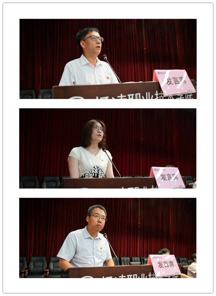 会上,生物工程分院党总支书记李岩、经济与贸易分院商务贸易党支部书记蒋霞、水利工程分院教师赵旭升分别代表先进党总支、先进党支部和优秀党员发言。