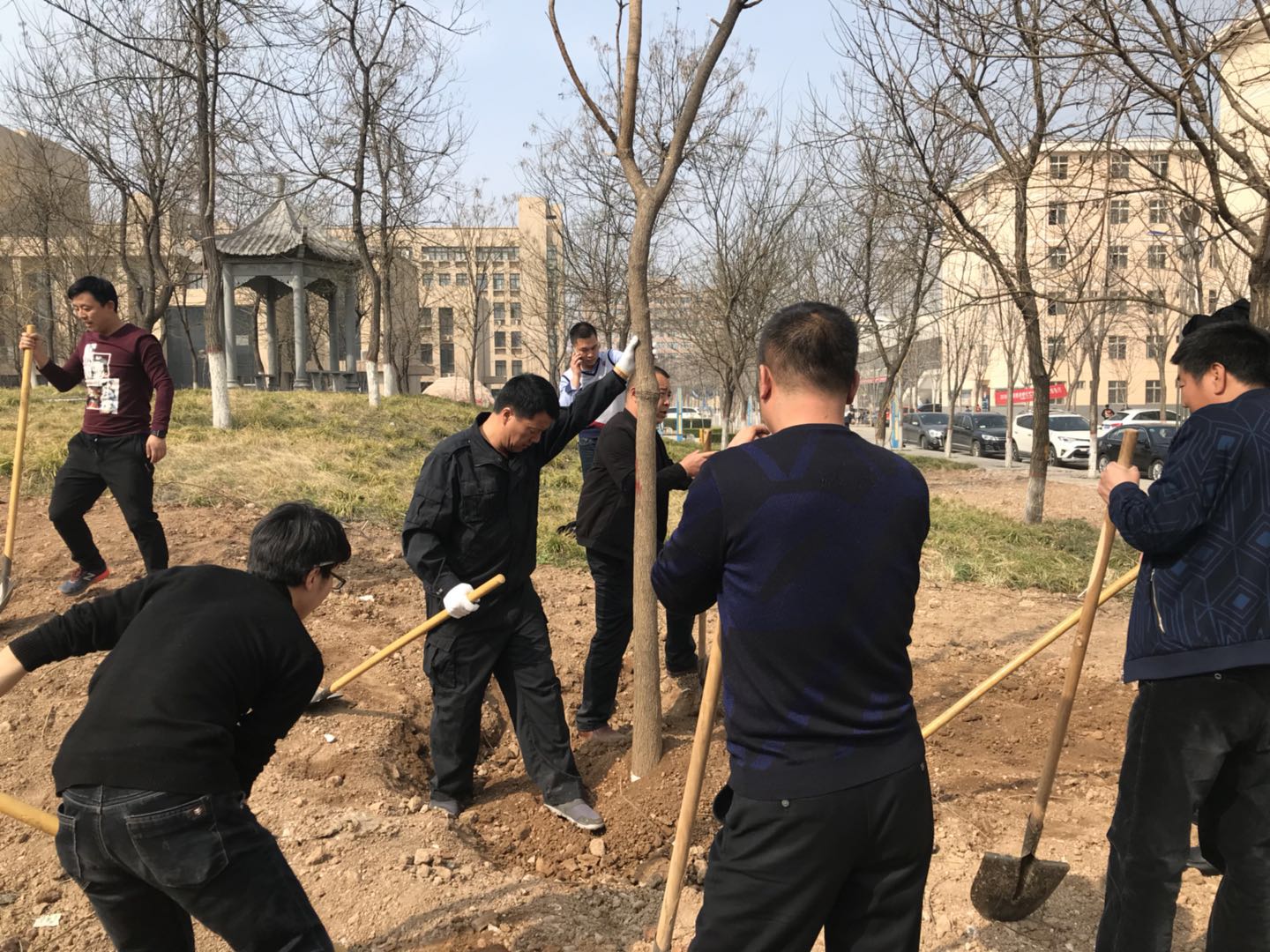 为营造良好的校园环境,后勤基建处将南校区101号公寓楼建设时设置的临时工棚作为清理对象,利用周末集中清理了基建垃圾,置换了新土,并按照校园规划选购了适生大树作为移栽绿化树木,提前整地。3月12日下午,30余名后勤基建处干部职工齐聚植树现场,共同参与植树活动,有的挖坑,有的搬运树苗,有的填土,大家相互协作、干劲十足。经过一个半小时的辛勤劳动,一棵棵充满生机和希望的树木植入泥土,在春风中昂然挺立、尽显生机。