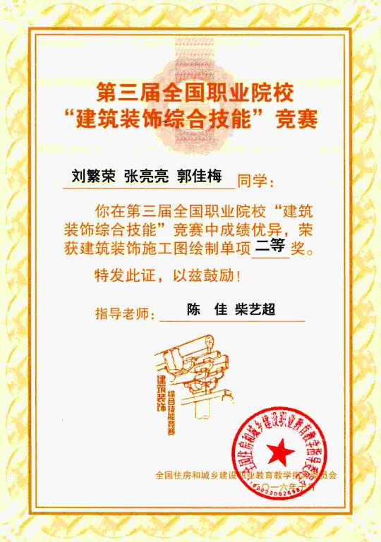 经过7个小时的紧张比赛,我院生态环境工程分院室内设计专业14级学生刘繁荣、张亮亮、郭佳梅三位同学荣获建筑装饰施工图绘制单项二等奖,指导教师是环境艺术教研室陈佳、柴艺超。