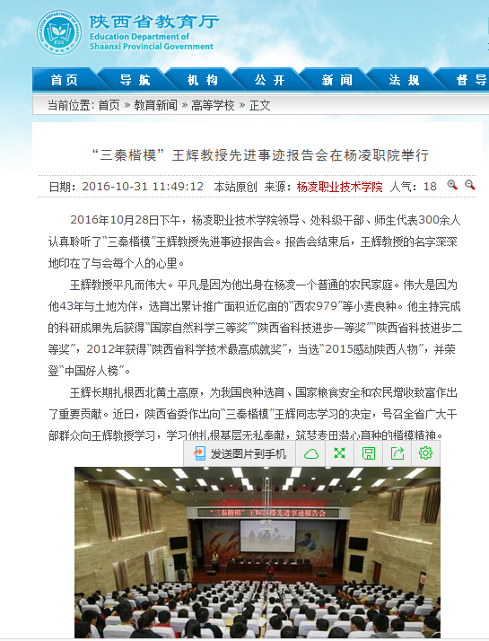 日,陕西省教育厅网 对“三秦楷模”王辉教授先进事迹报告会在我院举行进行了报道。