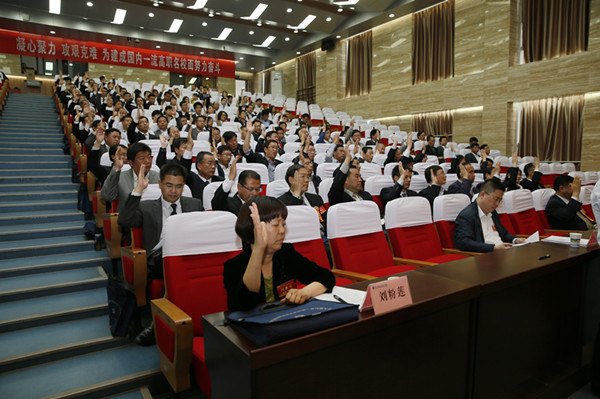 大会提出,今后一段时期,学院要遵循“创新、协调、绿色、开放、共享”发展理念,全面贯彻落实中、省关于教育改革发展的方针政策,坚持以立德树人为根本、以服务发展为宗旨、以促进就业为导向,坚持产教融合、校企合作、工学结合、知行合一,坚持深化改革、内涵发展,依法治校、民主管理,不断创新教学运行机制,全面提升教育教学质量。一是深化教育教学改革,构建一流人才培养体系;二是突出优势强化特色,服务一流专业发展体系建设;三是实施人才强校工程,构建一流人才和人事管理体系;四是改善优化办学条件,建设一流支撑和保障体系;五是加强科研推广和继续教育工作,提升社会服务能力;六是服务“一带一路”倡议,提升办学层次。