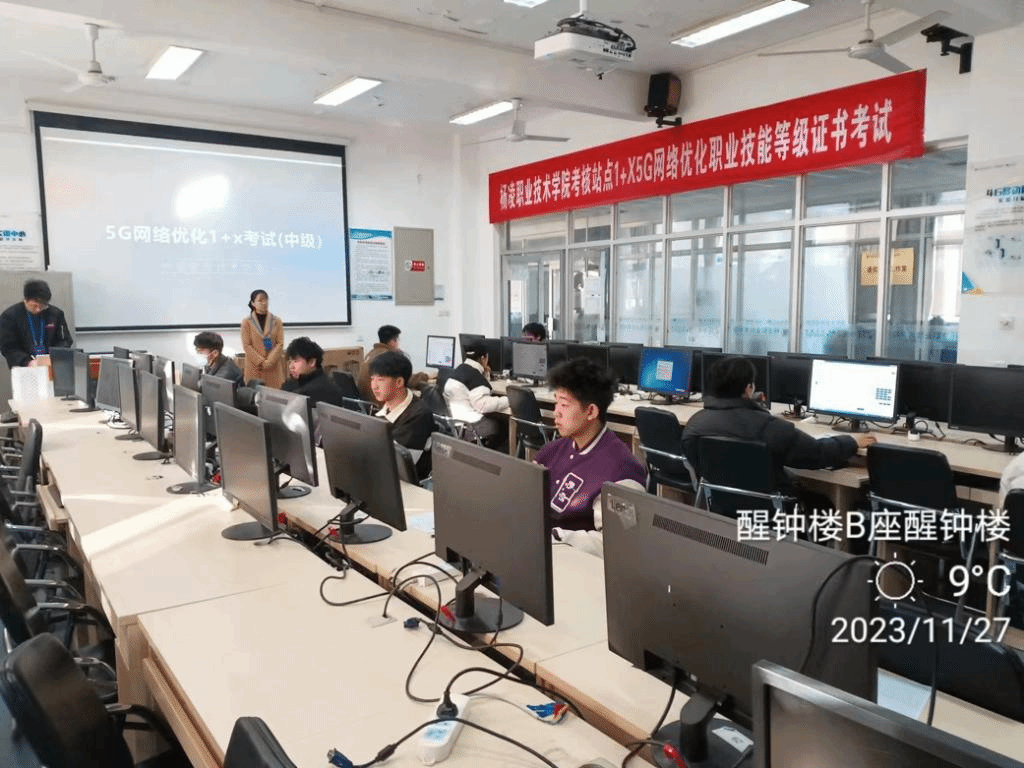 11月27日,“1+X”5G网络优化职业技能等级证书(中级)考试在南校区醒钟楼举行,信息工程学院现代通信技术专业22名学生参加考试。