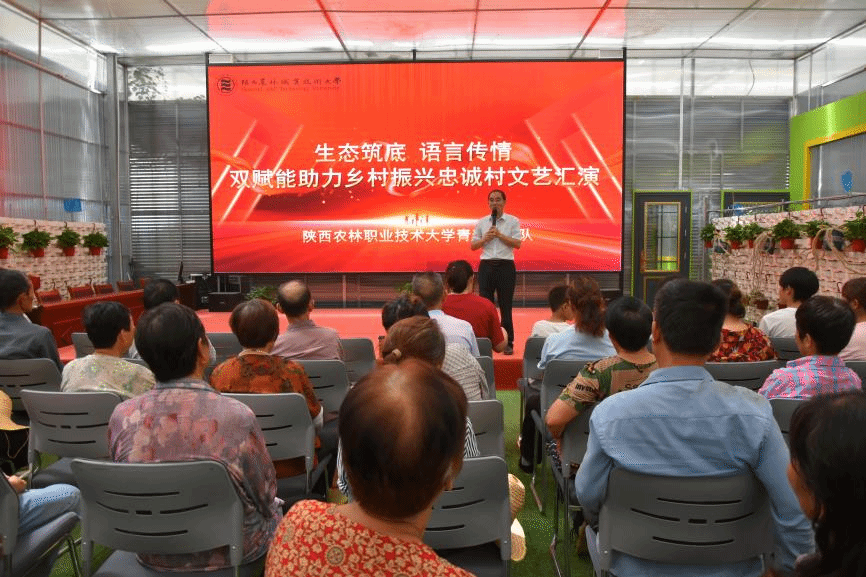 用活动传承“五位一体”的文化基因谱。青春队立足乡村文化需求,开展“普通话小讲堂”专题讲座;组织师生创作乡村振兴主题墙体彩绘;针对留守儿童实施“语润童心”计划;下乡文艺汇演以歌舞、朗诵等节目丰富群众生活,全国劳模、忠诚村党支部书记、村委会主任、天瑞塬公司总经理刘瑞红作为特邀嘉宾。