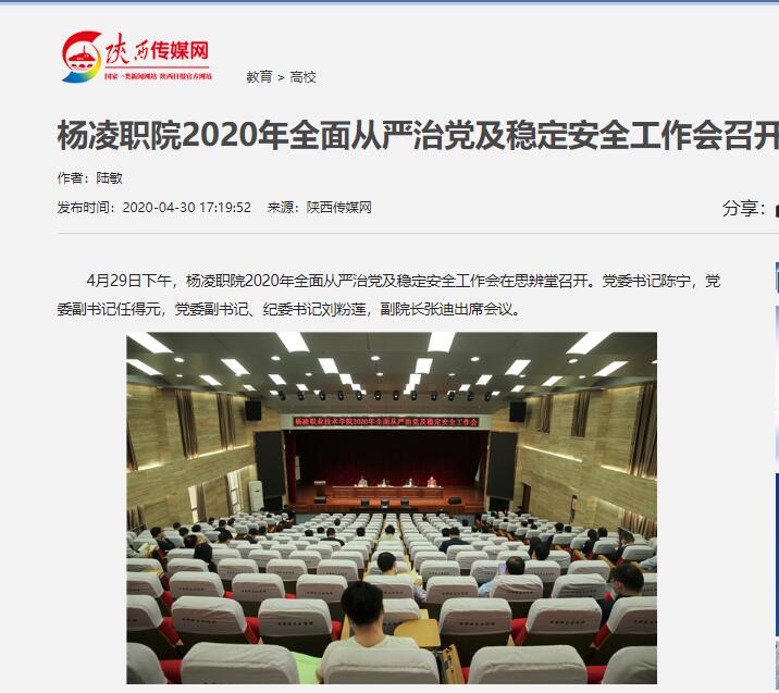 4月29日下午,杨凌职院2020年全面从严治党及稳定安全工作会在思辨堂召开。党委书记陈宁,党委副书记任得元,党委副书记、纪委书记刘粉莲,副院长张迪出席会议。