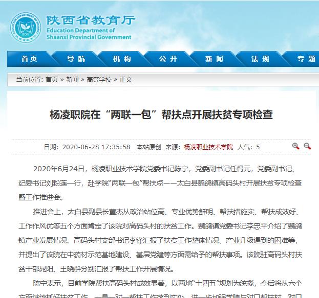 2020年6月24日,杨凌职业技术学院党委书记陈宁,党委副书记任得元,党委副书记、纪委书记刘粉莲一行,赴学院“两联一包”帮扶点——太白县鹦鸽镇高码头村开展扶贫专项检查暨工作推进会。