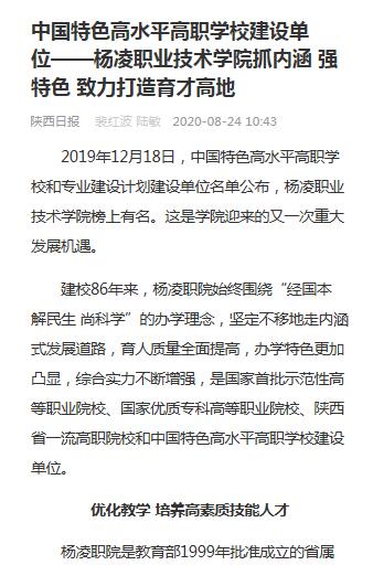 2019年12月18日,中国特色高水平高职学校和专业建设计划建设单位名单公布,杨凌职业技术学院榜上有名。这是学院迎来的又一次重大发展机遇。