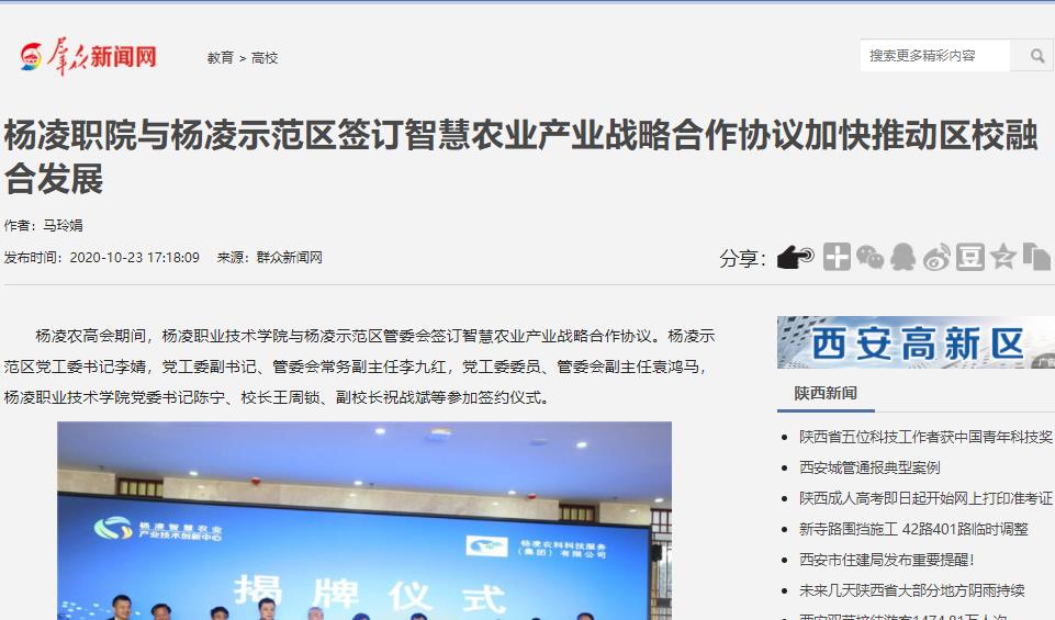 【群众新闻网】杨凌职院与杨凌示范区签订智慧农业产业战略合作协议 加快推动区校融合发展