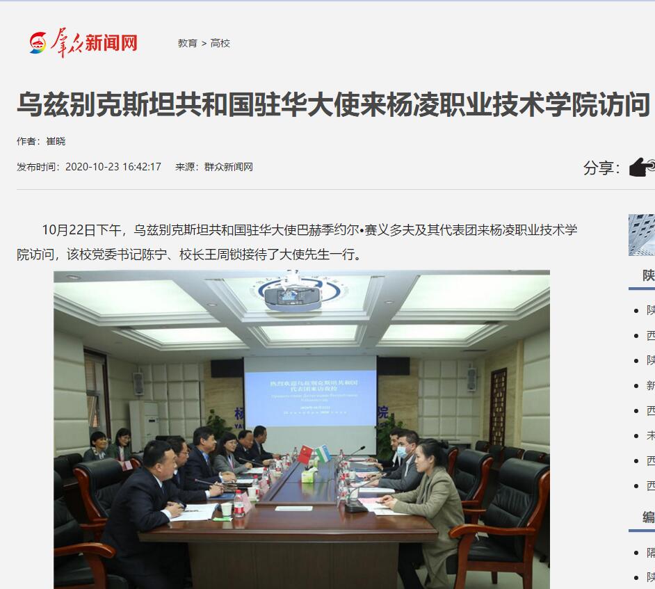 乌兹别克斯坦共和国驻华大使来杨凌职业技术学院访问座谈会现场