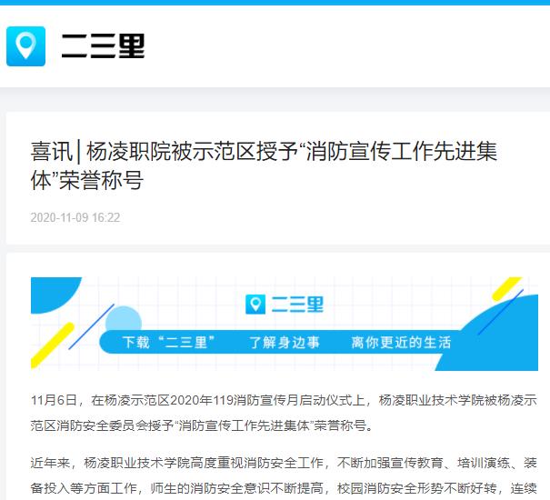 11月6日,在杨凌示范区2020年119消防宣传月启动仪式上,杨凌职业技术学院被杨凌示范区消防安全委员会授予“消防宣传工作先进集体”荣誉称号。