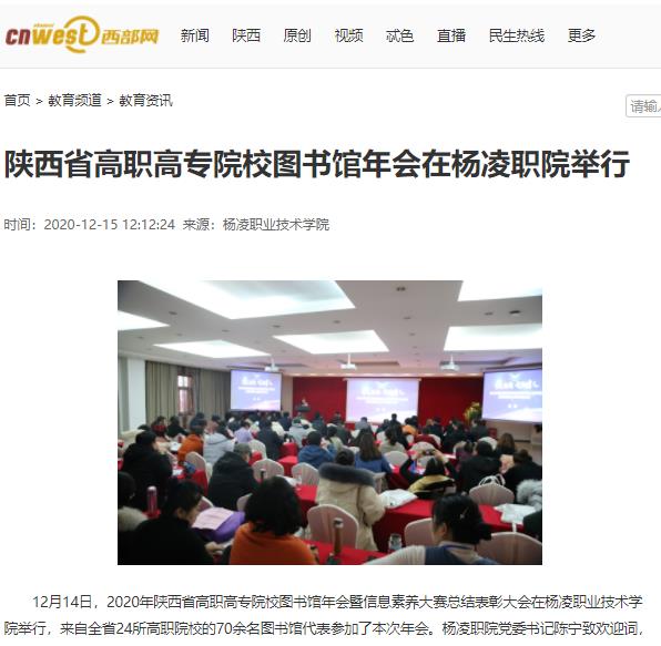 12月14日,2020年陕西省高职高专院校图书馆年会暨信息素养大赛总结表彰大会在杨凌职业技术学院举行,来自全省24所高职院校的70余名图书馆代表参加了本次年会。杨凌职院党委书记陈宁致欢迎词,副校长张迪主持开幕式。