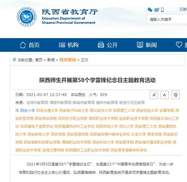 2021年3月5日是第58个“学雷锋纪念日”,也是第22个“中国青年志愿者服务日”,为进一步培育和践行社会主义核心价值观,弘扬雷锋精神,陕西教育系统开展多项学雷锋主题教育活动。