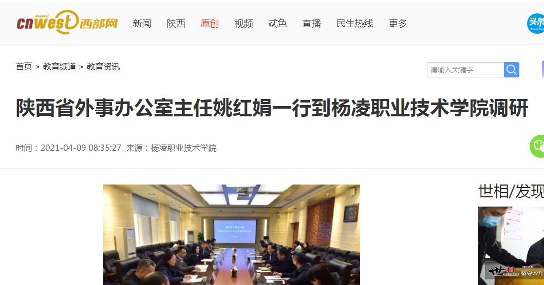 为进一步加强杨凌示范区的对外开放,4月7日,陕西省委外办主任姚红娟率省外办有关处室部门负责人一行到杨凌职业技术学院就职业教育的国际交流与合作工作进行调研,杨凌职业技术学院校长王周锁就学校相关工作进行了介绍。