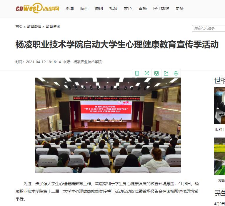 为进一步加强大学生心理健康教育工作,营造有利于学生身心健康发展的校园环境氛围,4月8日,杨凌职业技术学院第十二届“大学生心理健康教育宣传季”活动启动仪式暨首场报告会在该校醒钟楼思辨堂举行。